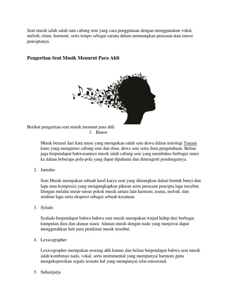 Pengertian seni musik adalah ilmu pengetahuan serta seni mengenai kombinasi ritmik dan beberapa nada, baik vokal ataupun instrumental yang .